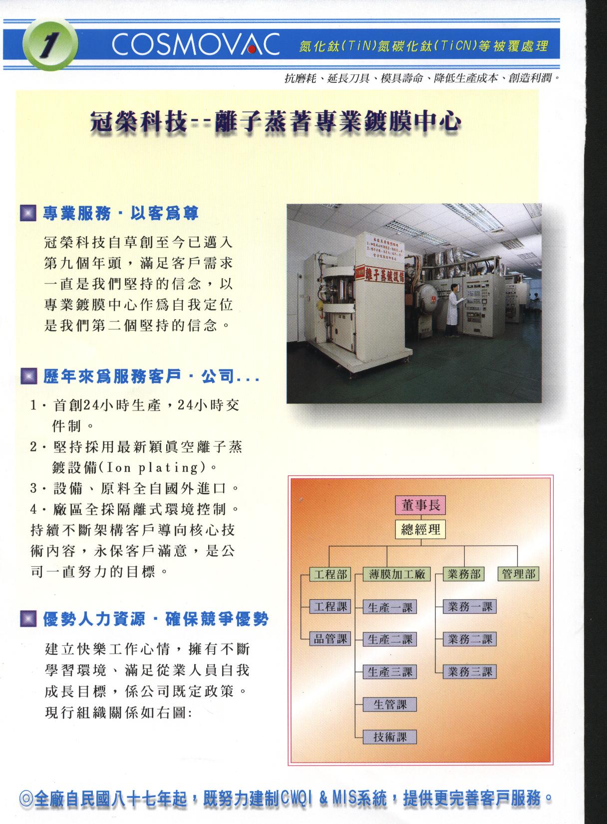 专业服务,以客为尊冠荣科技成立于公元1990年,自成立以来即以专业涂层(涂層,镀膜)中心为自我定位,我们为满足客户需求而日夜不断的努力,以追求更高的品质及更好的服务。