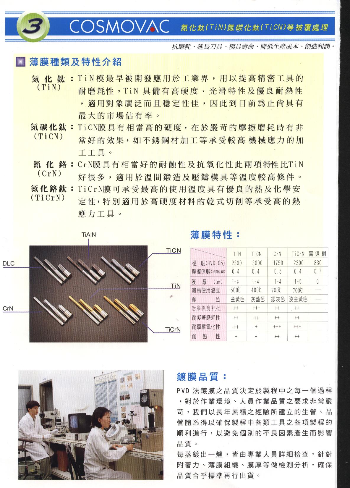 CrN氮化铬涂层/镀铬具有相当好的耐蚀性及抗氧化性此两项特性比TiN好很多,适用于温间锻造及压铸模具等温度较高条件,特性: